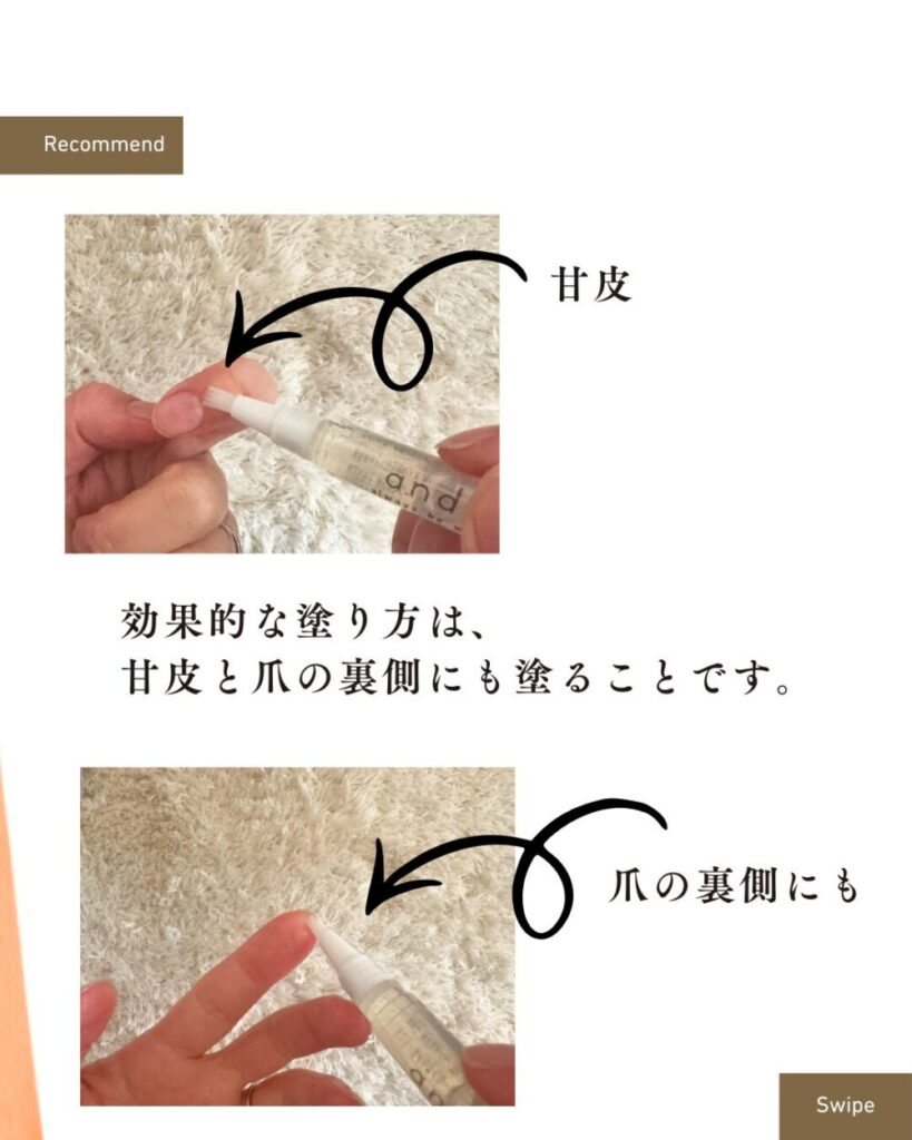 そうする事で、ハイポニキウムという爪と皮膚をつないでいる部分が保湿され、爪が丈夫になり、爪が縦長になることを助けてくれます。