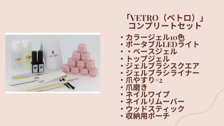 ライトや筆、溶剤だけでなく、コンパクトなライトやVETRO製造のカラージェルが10色も入ったフルセット。