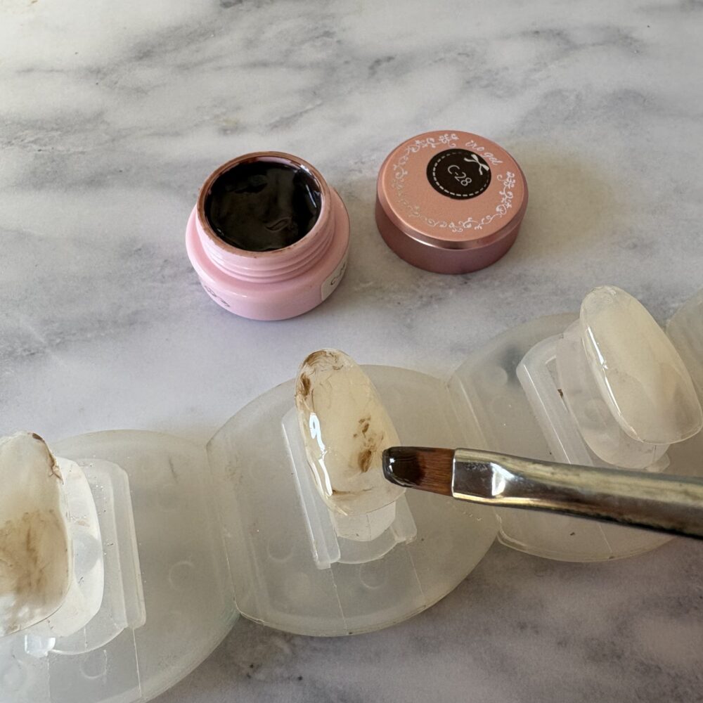 硬化しないままダークブラウンでちょんちょんと塗ります。