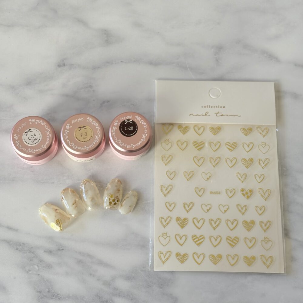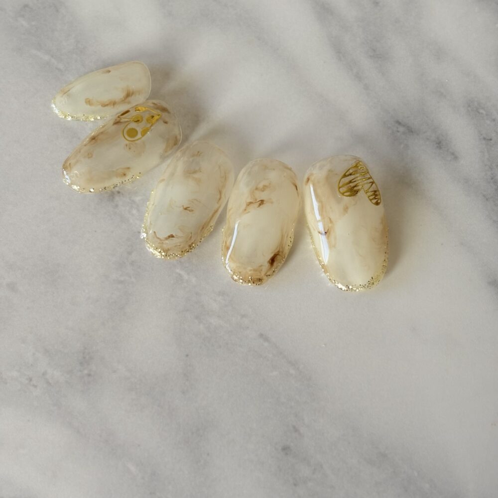 今回は、大理石風のベースにキラキラゴールドのラメとシールを使ったきれいめネイルを作りました。